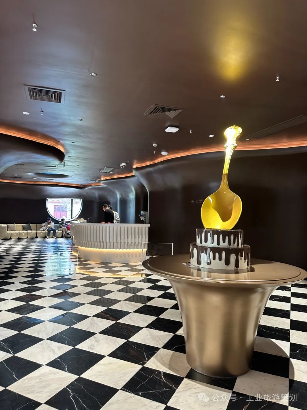正中间摆放着的一把正在挖巧克力蛋糕的金色勺子雕塑,成了阿姨妈妈的拍照打卡背景板。