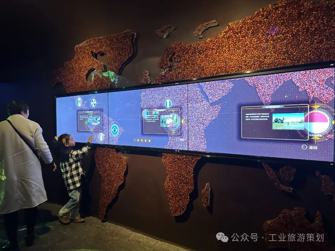 扫码后即可进馆参观,一句“什么是可可果?”开启序厅部分,互动屏上科普着全球范围的可可产地,就连背景墙也是由可可果制成的滴胶装饰。